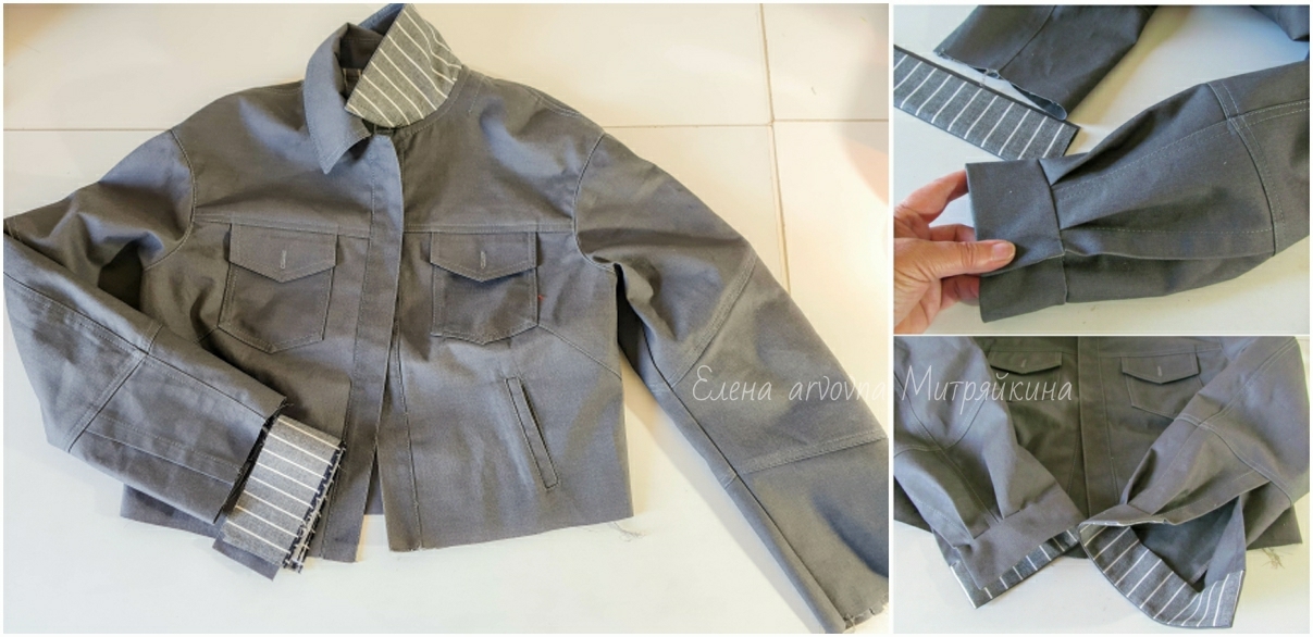 Дополнительно, чтобы все уместить, и чтобы при пошиве избежать ненужных утолщений в смежных швах, при работе с джинсовыми тканями использую свой излюбленный прием - все подкройные детали выкраивать из ткани-компаньона. Обычно это хлопок. Так, внутренние кокетки полочек, подворотник, подклапаны, обтачка горловины спинки, внутренний манжет и мешковины в моей курточке выполнены из того же "звериного" хлопка, что и на сарафане, им же окантованы подборта, остальное под оверлок. Для куртки дочери использовали вареный хлопок серого цвета в полоску. При этом все обтачные детали из хлопка в обоих случаях продублированы.